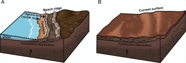 下图显示了海岸在地球上是如何积累的。”“前滨”是指积聚在“大潮位”(大潮时的海岸线)和“低潮位”(低潮时的海岸线上)之间的海滩,水在这里反复下沉和浮出水面。火星地下也发现了类似的海岸线。